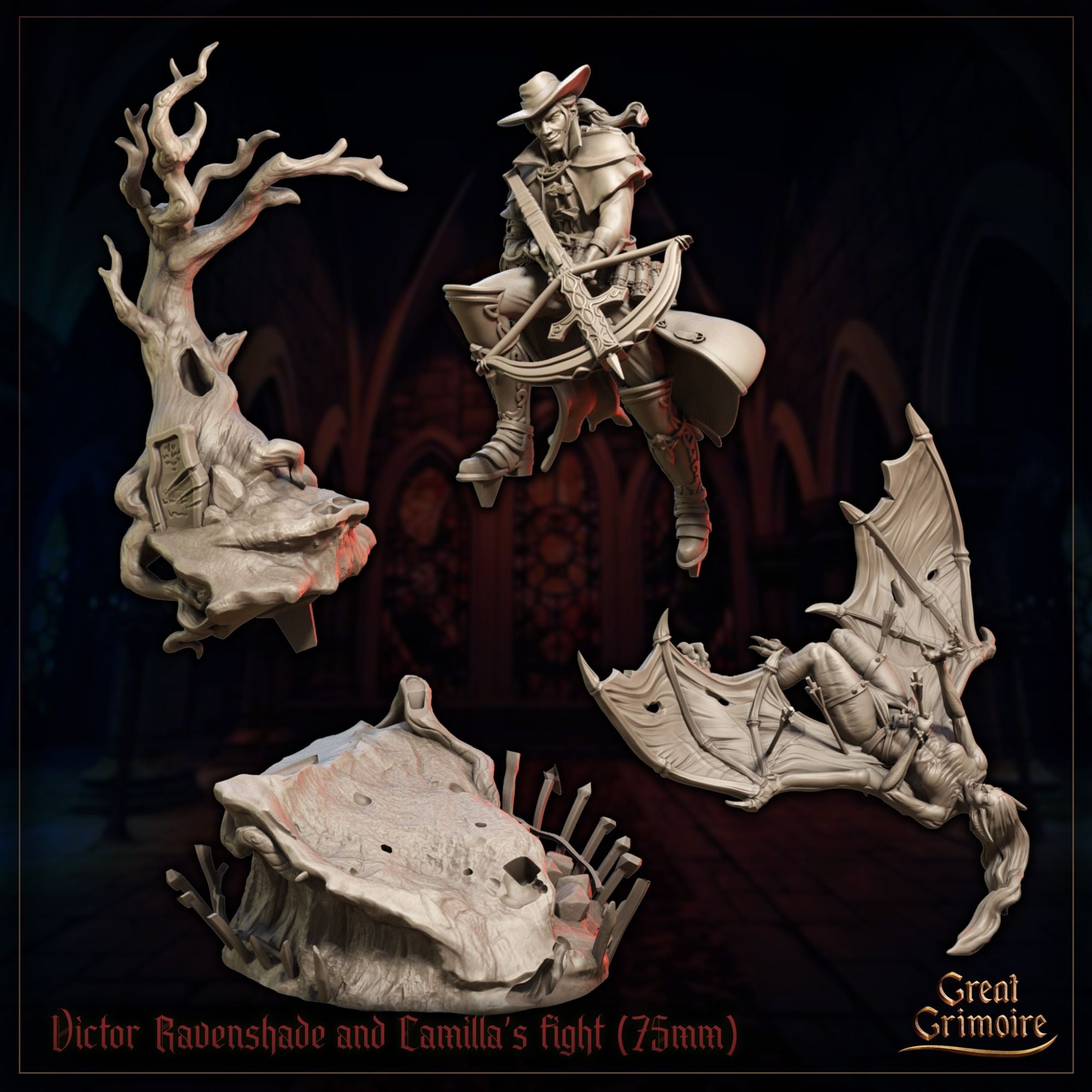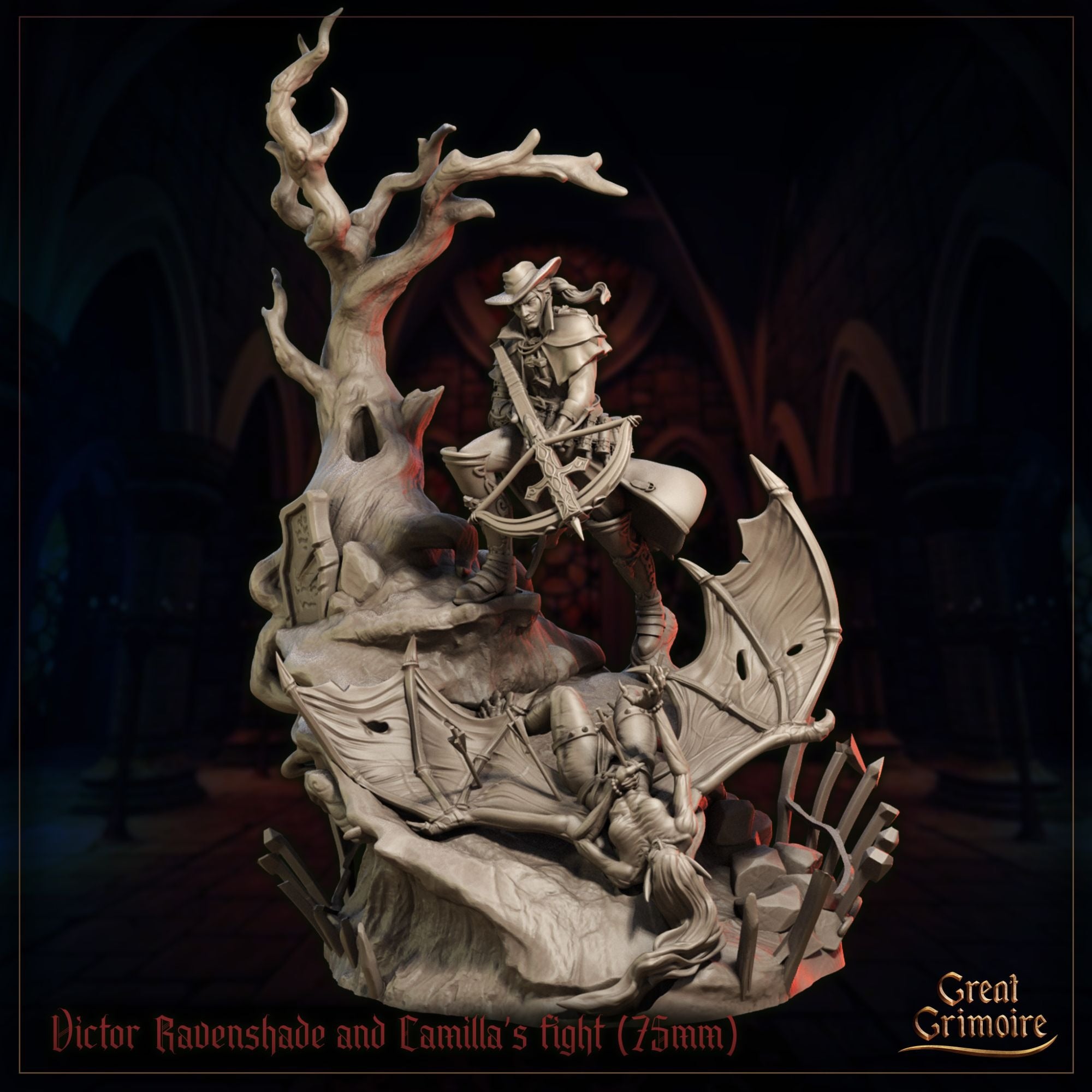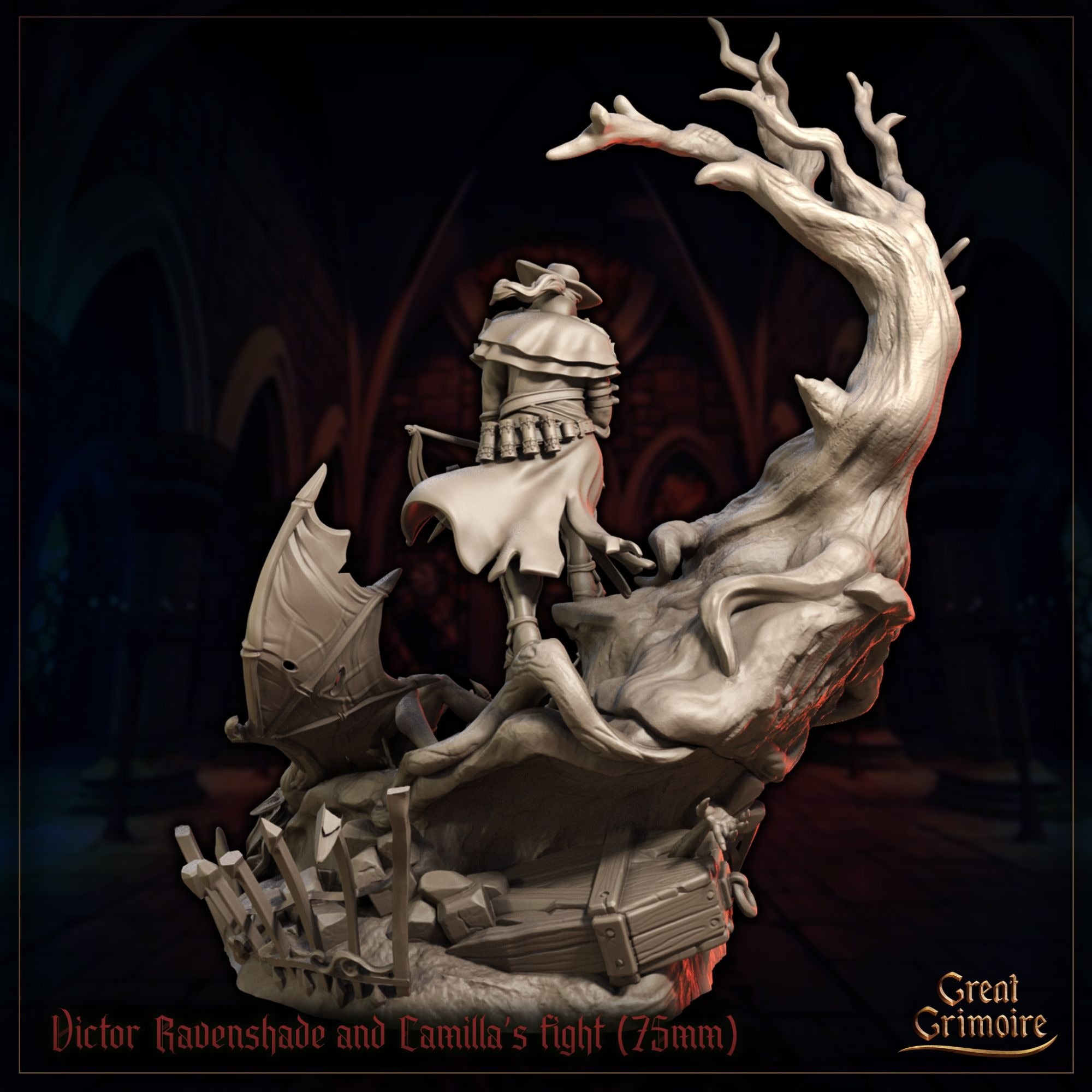 Victor Ravenshade and Camilla Fight - 75mm scale diorama - 3d printed Miniature Sculpted by Great Grimoire